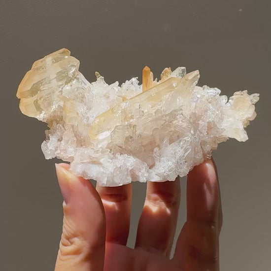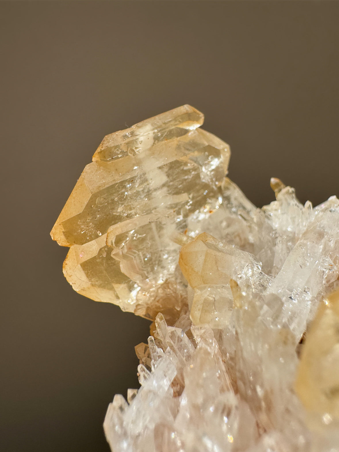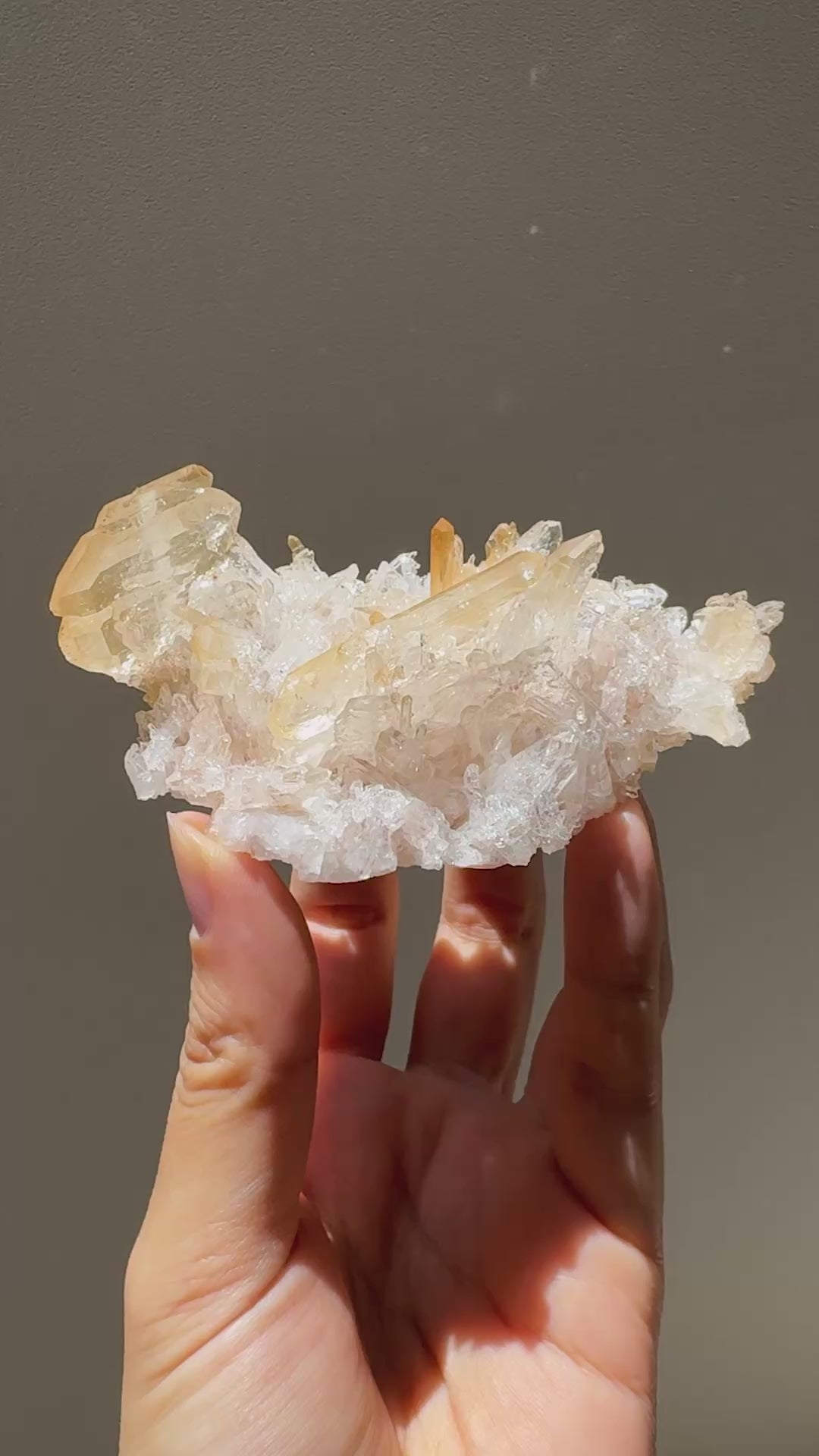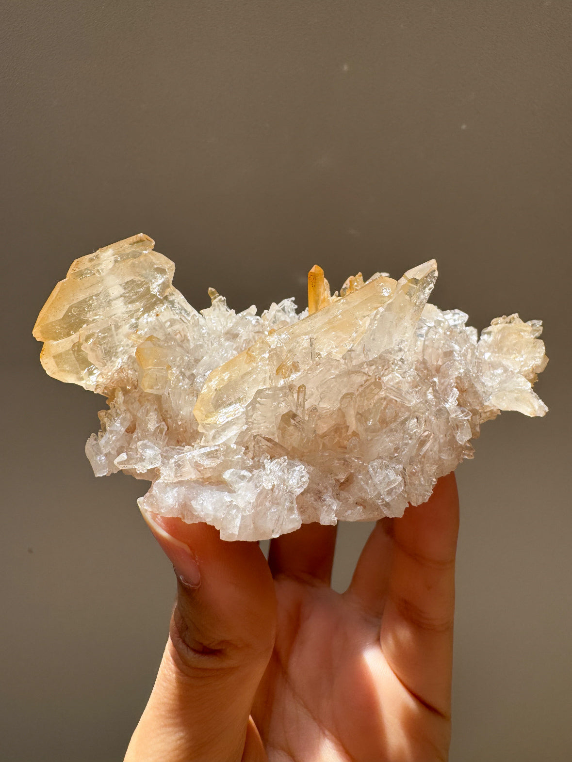 コロンビア、エルペニョンから高品質のファデンクォーツ原石。高透明度の水晶ポイントはとても繊細で、可愛いベイビーピンクを発色し、大きいファデンは暖かみのあるイエローオレンジを発色します。裏面も水晶だらけのフローター。