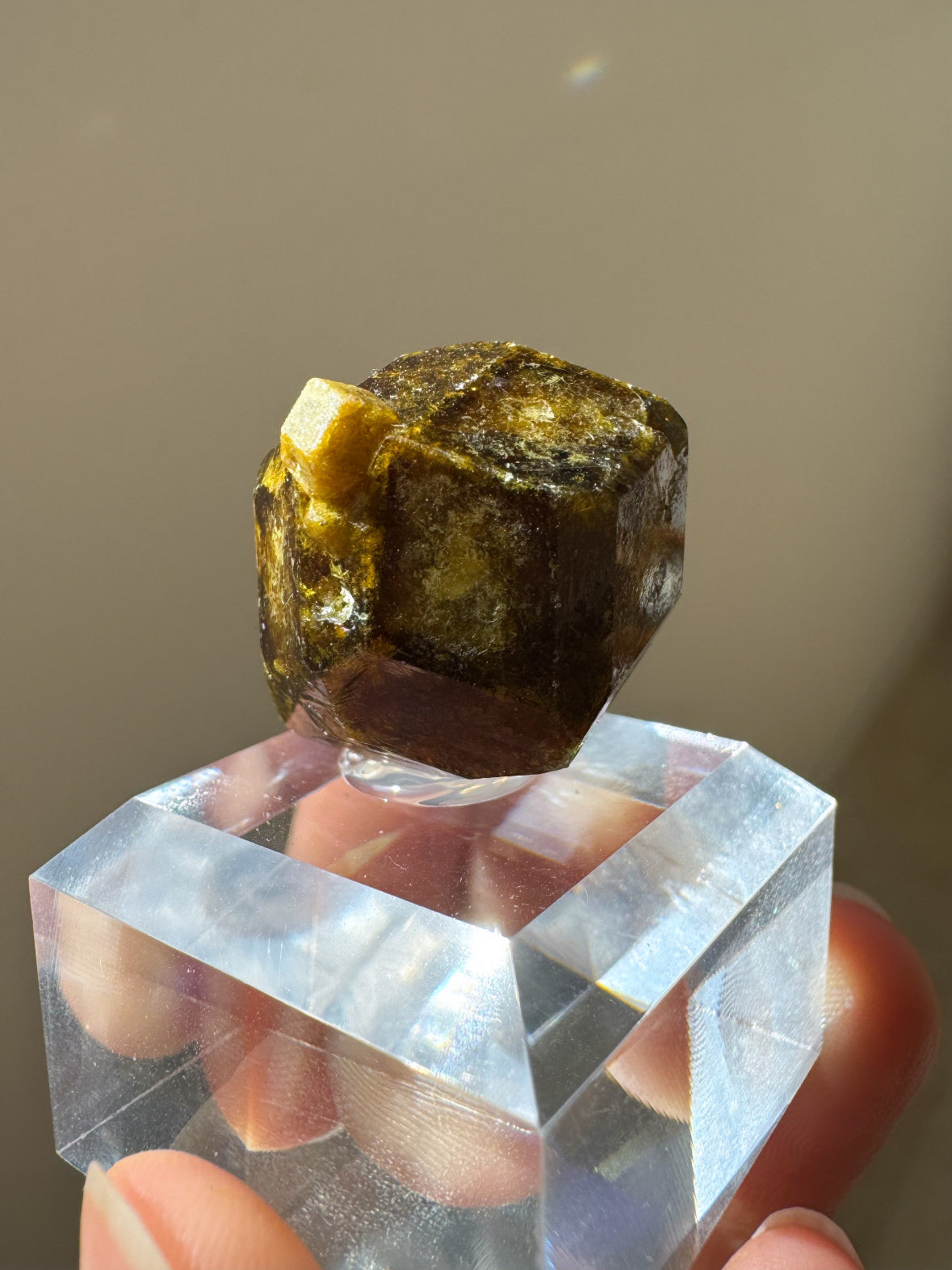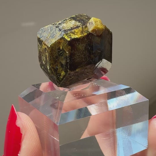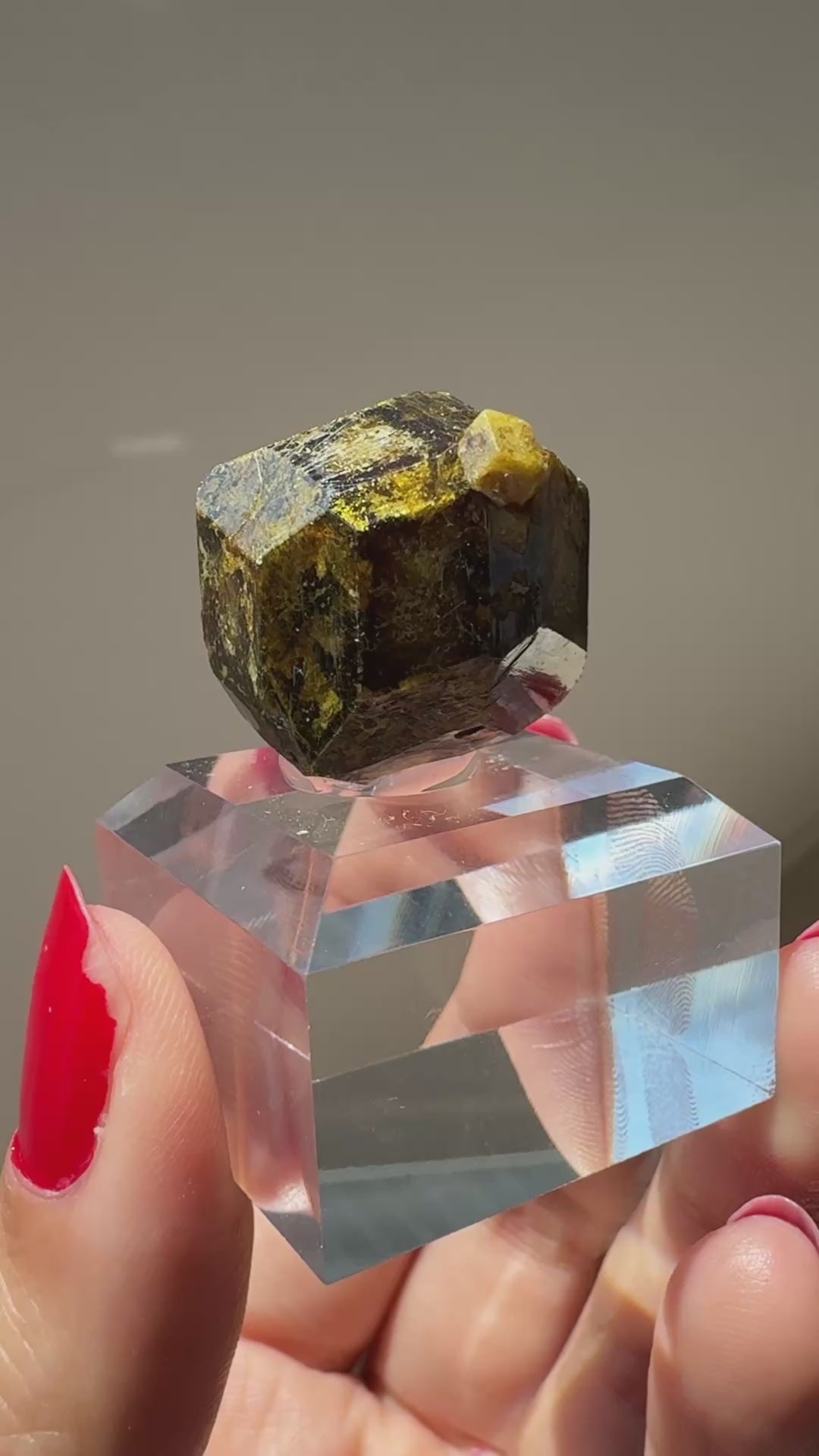 マリから高品質のアンドラダイト(グリーンガーネット)原石。照りがとても高く、色合いも黄緑ベースに茶色の縁が楽しめる美しいフォルム。大きい結晶に、ベイビーサイズの子が付いている素晴らしい標本。