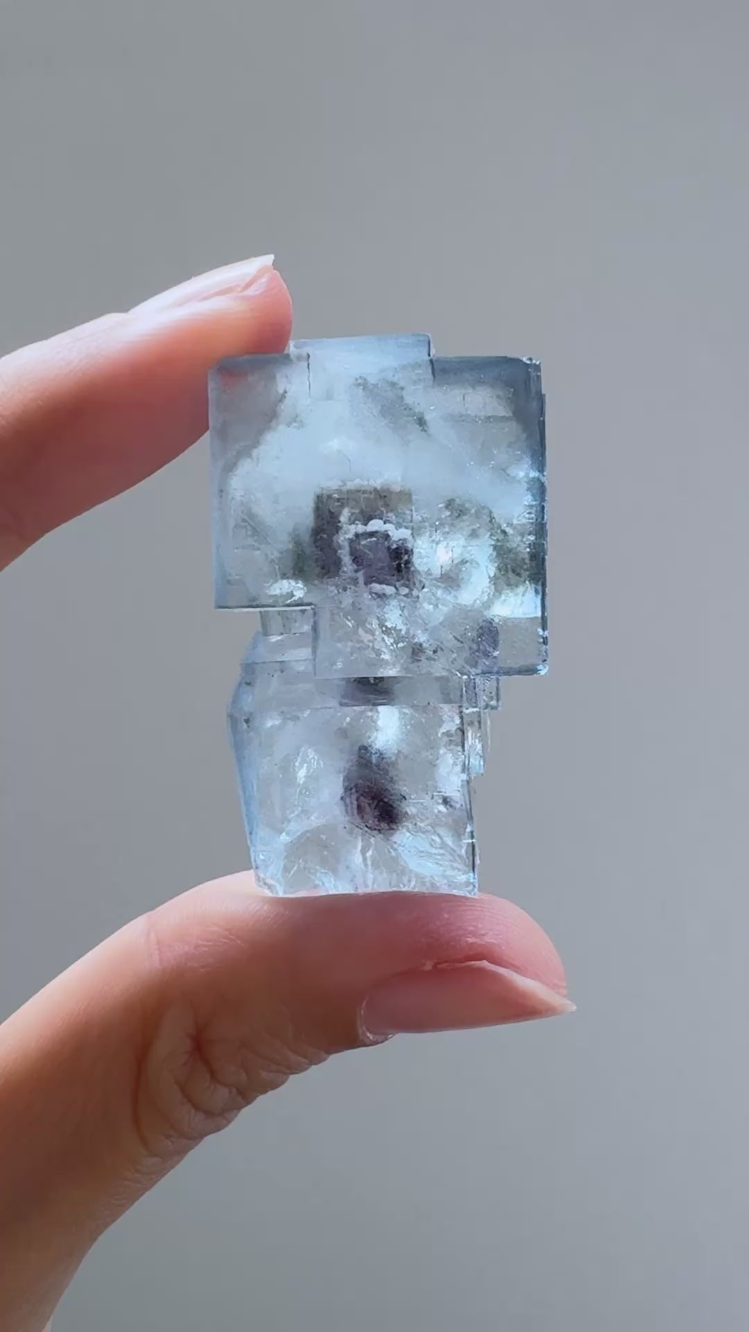 中国、ヤオガンシャン鉱山から高品質のツインフローライトキューブ。高透明度のブルーフローライトキューブのの淵には濃いブルーのウィンドウがあり、中には紫のファントムがくっきり顔を見せます。繊細な白いインクルージョンも入っている美しい標本。
