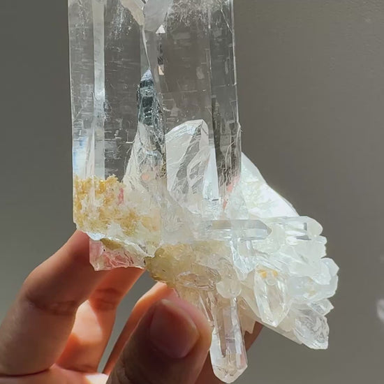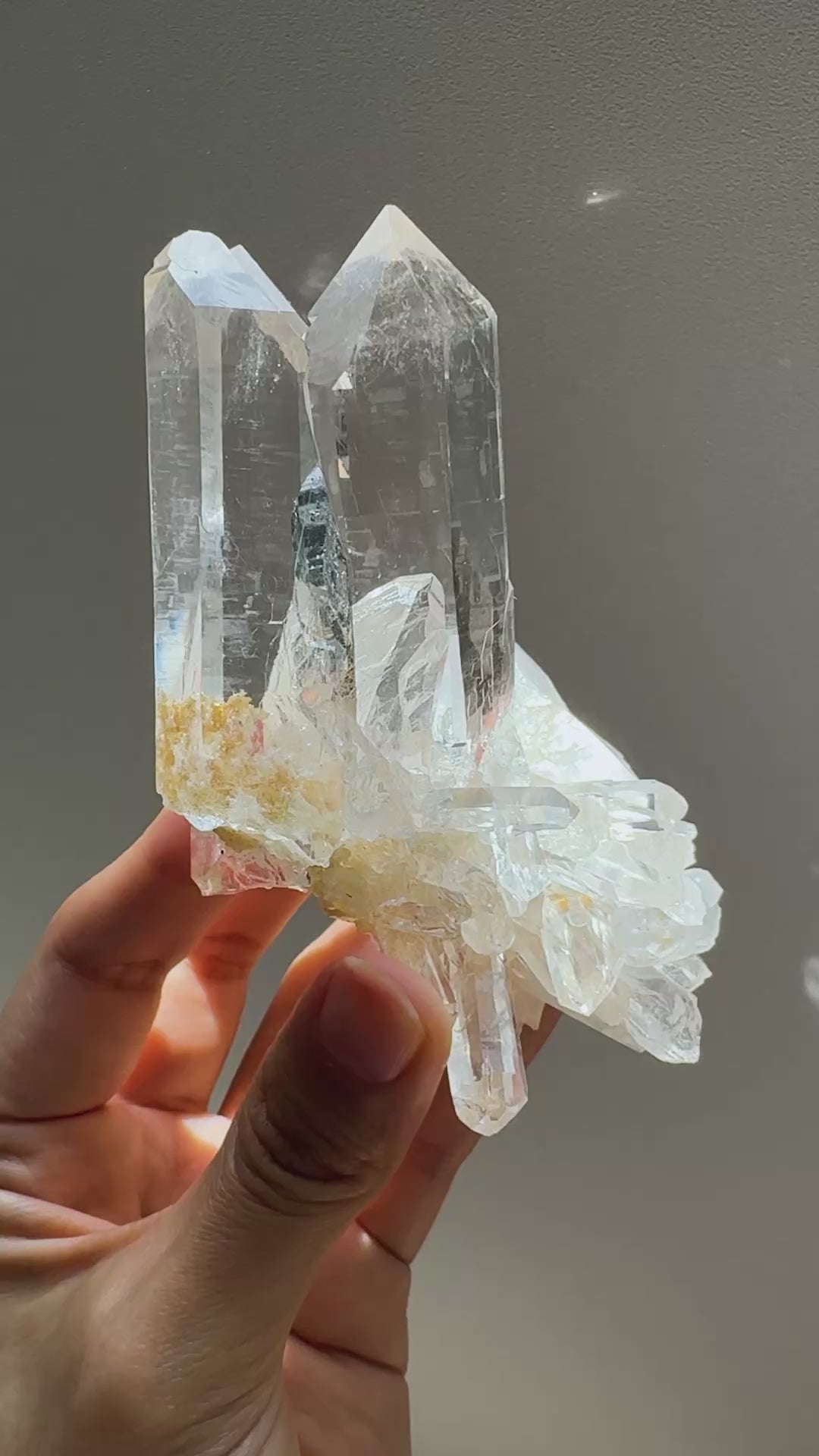 ブラジル、ディアマンティーナ地域で最も有名なカバサコ鉱山から高品質の水晶原石ポイント。透明度と照りがとても高く、見るだけでも綺麗なエネルギーを感じ取ることができる美しいクリスタル。大きなタントリックツインとシングルポイント、小さい水晶のクラスター、そしてガーデンのインクルージョンも楽しめる芸術的なフォルム。