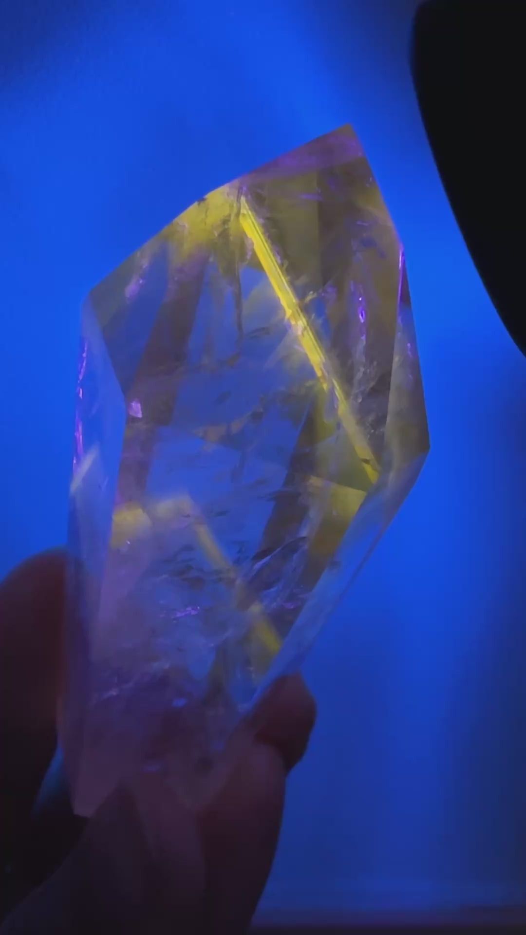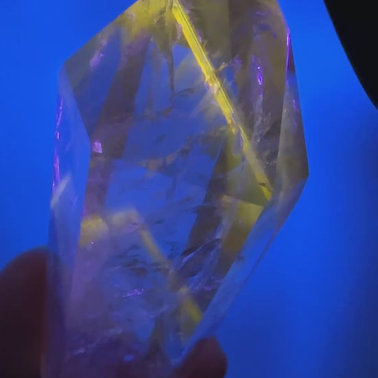 ブラジル・バイーア州・Cordeirosからのパウエル石ファントム入りアメジストタワー。UVライトを照らすと、高透明度の水晶の中でパウエル石のファントムが黄色に蛍光します。