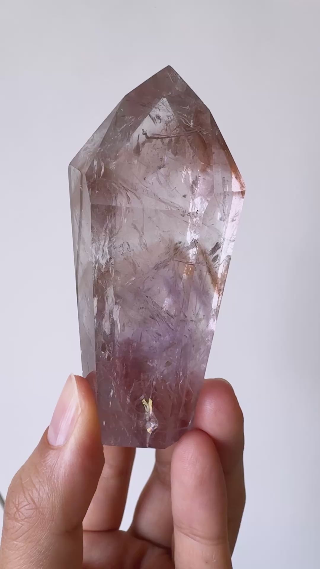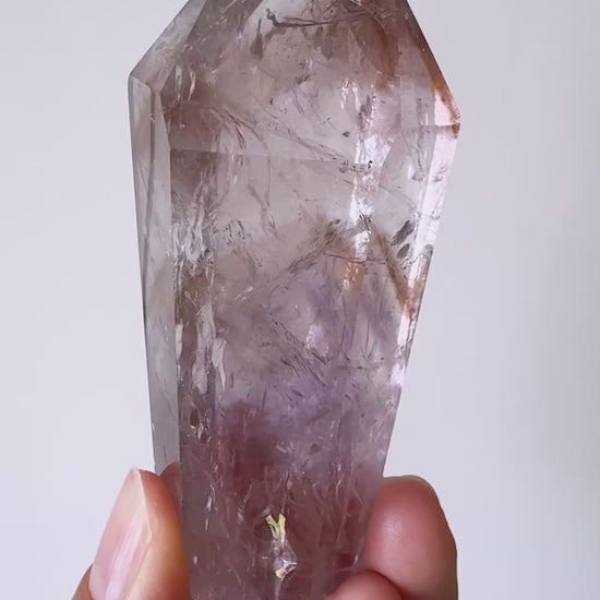この珍しいクリスタルは、数年前に初めて発見され、最近再び市場に出回っています。数年前のアメリカ研究所での検査結果で鮮やかな黄色を放つ蛍光のファントムは、希少鉱物であるパウエル石によるものであることが判明されました。パウエル石は、アメジストはもちろんのこと、クォーツに含まれるインクルージョンとしては稀と言われています。