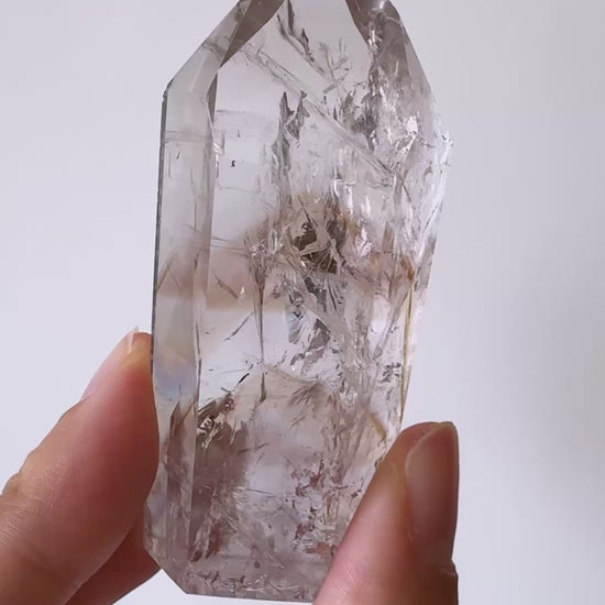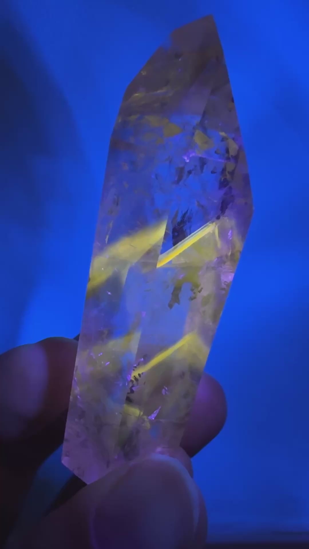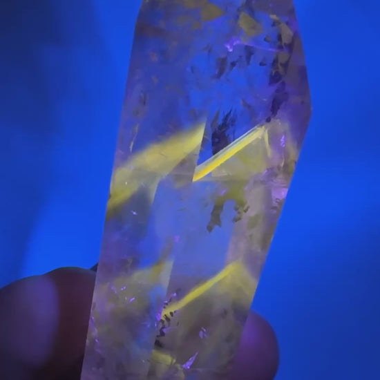 この珍しいクリスタルは、数年前に初めて発見され、最近再び市場に出回っています。数年前のアメリカ研究所での検査結果で鮮やかな黄色を放つ蛍光のファントムは、希少鉱物であるパウエル石によるものであることが判明されました。パウエル石は、アメジストはもちろんのこと、クォーツに含まれるインクルージョンとしては稀と言われています。