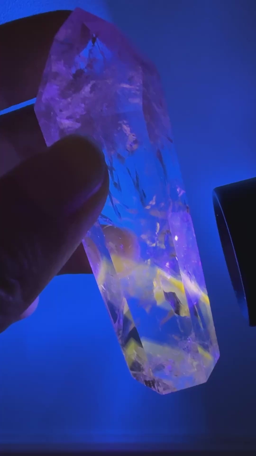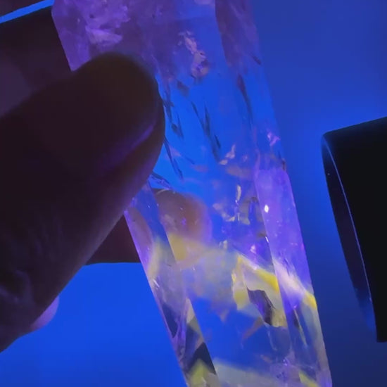ブラジル・バイーア州・Cordeirosからのパウエル石ファントム入りアメジストタワー。UVライトを照らすと、高透明度の水晶の中でパウエル石のファントムが黄色に蛍光します。