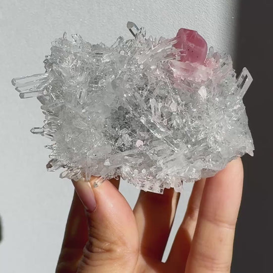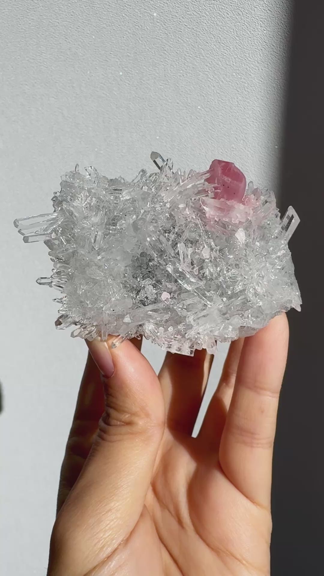 こちらのクラスターは、水晶ポイント一本一本の透明度が非常に高く、コロンビア産のオプティカル水晶を思わせます。ロードクロサイトは花びらのような形状で、濃厚で鮮やかなピンク色が印象的です。美しく自立し、ディスプレイピースとしても、コレクションピースとしても魅力的な一点です。